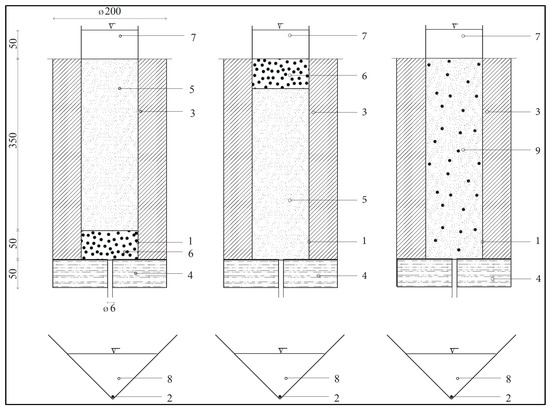 Layout of the column setup used for simulating freezing/thawing conditions. The figure represents the three tested placements of charcoal within the filter, i.e., underlying the sand layer (left), overlying the sand layer (middle), and homogeneously mixed with the sand (right). 1 = thermocouple; 2 = actuator; 3 = lateral insulation; 4 = bottom insulation; 5 = sand; 6 = adsorbent (charcoal); 7 = ponding water at +2 ± 0.5 °C; 8 = percolated water; 9 = charcoal mixed homogeneously with sand. Units in mm.
