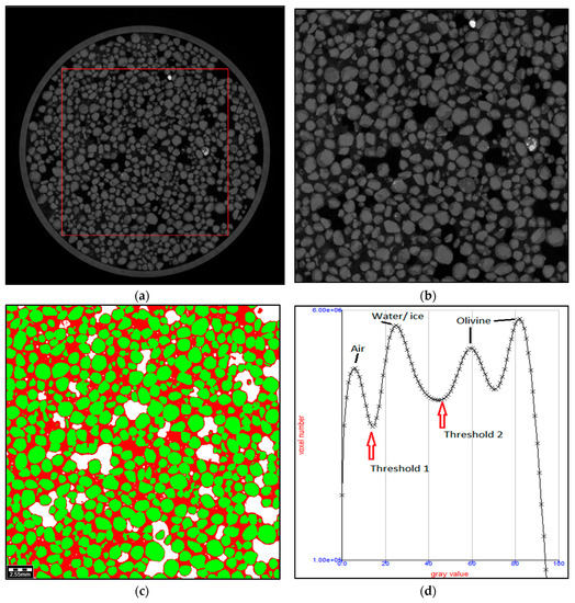Schematic conversion sequence for saturated olivine from raw image (a,b) to segmented image (c), the three elements composing the sample are identified; water content is represented in red color, particle content in green color, and air in white color. (d), the X-ray absorption histogram is presented with the thresholds that split into individual elements.