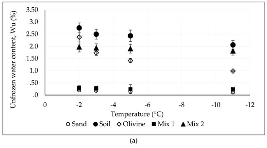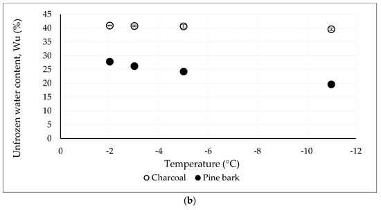 Figure 4 shows a cross plot of the gravimetric unfrozen water content, Wu, versus the temperature. The amount of unfrozen water varies from 0.11% for sand to 40.9% for charcoal, for a temperature range from 0 to −11 °C (Figure 4). The large specific surface area of charcoal (882 m2/g, obtained with Brunauer–Emmett–Teller test), and the increasingly smaller pore size within the bark [46] can explained the largest amount of unfrozen water measured in these organic materials. On the other hand, the lack of fines and micro porosity (surface area = 0.56 m2/g) of the sand (80% of SiO2 by weight) can explain the smallest amount of unfrozen water measured in this study (Figure 4a). Presence of silt and clay fractions will lead to larger surface area by increasing the micro porosity and, consequently, larger unfrozen water contents, as the typical soil for bio-infiltration showed (2%–2.7%). Note that the mix 1 has a slightly higher unfrozen water content compared to the sand due to the relatively low unfrozen water content present in the olivine. However, in mix 2, the amendment of sand with 5% charcoal helped to increase the unfrozen water content of the mixture by a factor of 10.