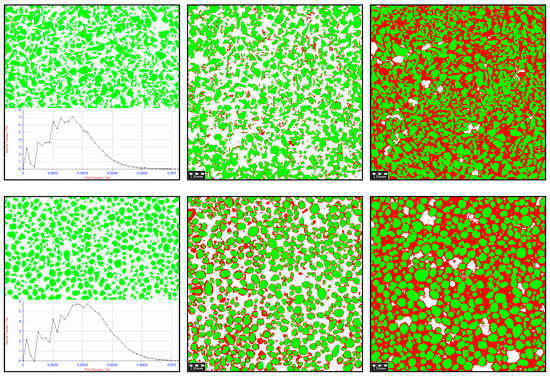 Figure 5 illustrates the distribution of air, water and solids in the XRT images of oven-dried, field capacity, and saturated samples. The figure shows a horizontal slice for each material at the water content for −2.5 °C. Volume fractions of air, water and solids obtained from the three-dimensional images are given in Table 4 and discussed in the following for the different materials presented in this study.