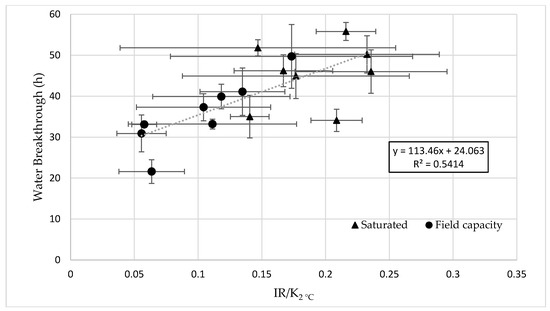 IR/ K2 °C vs water breakthrough for the different column tests.