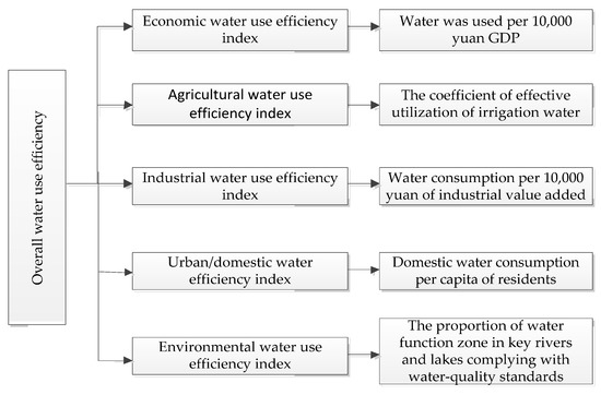 Water use industries include industrial, agricultural, and urban/domestic use, and environmental water-quality is also an important issue. Any comprehensive assessment of water use should consider all of these factors. Therefore, five water use efficiency evaluation indexes are chosen: an index concerning water use per economic output; an index for each of agricultural, industrial, urban water use efficiency; and an index for environmental water quality, as shown in Figure 1.