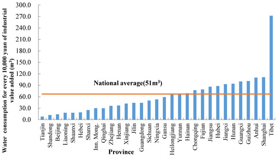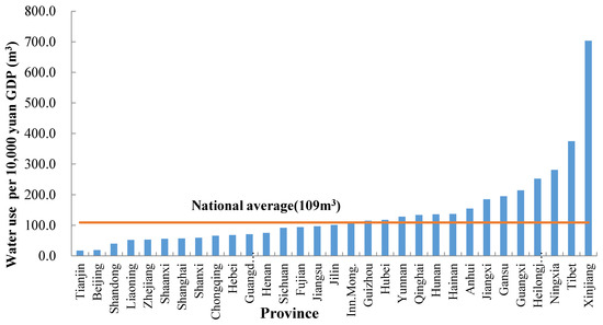 In 2013, 109 m3 water was used per 10,000 yuan GDP (at 2013 prices) in China. Broken down by province (Figure 2), the water use ranged from 17 to 703 m3 water per 10,000 yuan GDP; Xinjiang had the highest value and Tianjin the lowest. Beijing was another notable case with 19 m3 per 10,000 yuan GDP. Eight areas (including Beijing, Tianjin, Shandong, and Liaoning) had water use below 60 m3 per 10,000 yuan GDP. For international comparison, Japan used 168 m3 water per 10,000 United States dollars (USD) GDP in 2013 [25], and the United States of America used 358 m3 per 10,000 USD GDP in 2013 [26]. The Chinese equivalent was 569 m3 per 10,000 USD GDP in 2013.