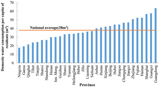 In 2013, the average domestic water consumption per capita of Chinese residents was 38 m3, and the domestic water consumption per capita of each region was unbalanced. The domestic water consumption per capita of Ningxia and Gansu residents was less than 20 m3, while that of Guangdong was 63 m3, and that of Guangxi, Shanghai and Hainan was more than 50 m3. The domestic water consumption per capita of residents in these regions was significantly higher than the average level of China (Figure 5).