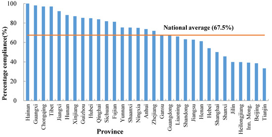 In 2013, the proportion of water function zone in key rivers and lakes complying with water-quality standards in China was 67.5%. Values in the different provinces ranged between 33% and 100%, with the highest in Hainan province and the lowest in Tianjin (Figure 6).