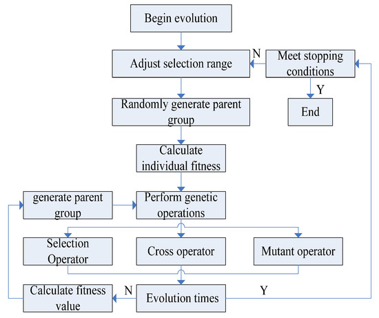 The choosing, crossing, and variation operations of the RAGA produce three generation groups; next, a choice of N (group size) excellent individuals is made for the next parent population. After operation for a certain time, the accelerating genetic algorithm is started, and the selective areas for the excellent individuals are reduced (respectively, S excellent individuals from M times evolutionary iterations, in total a variation interval of M × S is used as the next variable interval of the accelerating genetic algorithm). In this way, the evolutionary iteration and the accelerating genetic algorithm alternately and repeatedly take the genetic evaluative gradually closer to the optimal individual. As the proximity to the optimal individual and the density of individuals increase, the probability of premature convergence is reduced to some extent. The process of the accelerating genetic algorithm is shown in Figure 7.
