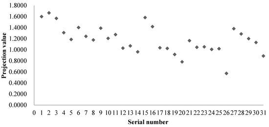 Using the example of water use in China′s 31 province-level divisions in 2013, we synthetically evaluate the water use efficiency based on the projection pursuit cluster model and the RAGA. First, the index values for each province are normalized. These indexes are economic water use efficiency, agricultural water use efficiency, industrial water use efficiency, urban water distribution efficiency, and environmental water quality. A projection index function then emerges by combining the sample sets using the substitution Equations (10), (12)–(14), The maximum projection index function is 0.7014, and the optimal projection direction is = (0.3533, 0.7014, 0.4538, 0.3315, 0.1217). According to Equation (11), the weight of each indicator (the contribution of the indicator to the result) is determined as = (0.1248, 0.4920, 0.2100, 0.1099, 0.0148). These values are obtained according to the problems identified by Equations (15) and (16) and optimized with the RAGA. The projected values for each province are then acquired by substituting into Equation (15). The results are shown in Figure 8.