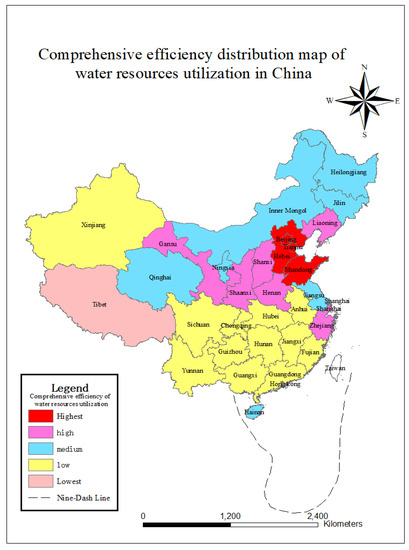 The provinces with the highest water use efficiency are concentrated in the Beijing-Tianjin-Hebei region. The provinces with lower and lowest water use efficiency are located in the marginal regions of China such as Xinjiang, Heilongjiang, Guangxi, Yunnan, and Tibet. The overall water use efficiency of China shows a trend of gradual decline from the Beijing-Tianjin-Hebei region as the center to the surrounding areas, as shown in Figure 9. The water use efficiency is affected by the total amount of water resources and the status of regional economic development. The water use efficiency of different industries is different in different regions. The present situation of the total water resources distribution in China also presents the trend of more in the south and less in the north as well as more in the east and less in the west. Most of the water resources in the Beijing-Tianjin-Hebei region are drawn from the mid-line project of the South-to-North Water Transfer Project in China, which determines that the total amount of water resources available in Beijing, Tianjin, and Hebei is small. Under the limitation of total amount of water resources, the economically developed areas such as Beijing, Tianjin, and Hebei must improve the water use efficiency. The water saving and water use efficiency policies formulated by the Chinese government are first carried out in the economically developed areas such as Beijing, Tianjin, and Hebei, which speeds up the pace of improving the efficiency of water resource utilization. At the same time, the industrial and agricultural technology development in Beijing, Tianjin, and Hebei is also the basis for efficient utilization of water resources. On the contrary, economic development in Xinjiang, Heilongjiang, Guangxi, Yunnan, and other regions is backward; the awareness of efficient use of water resources is not high, and the total amount of water resources is relatively abundant, resulting in low water use efficiency of these provinces. This study makes a detailed description of China′s current water use efficiency, gives clear data support for the Chinese government to formulate guidelines for water use management, and provides decision-making basis for China to further improve the comprehensive level of water use efficiency.