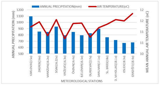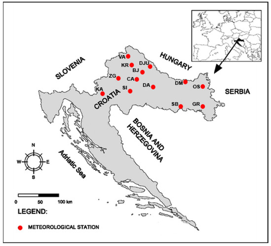 The study area is the continental region of Croatia. It is part of the Danube River Basin (Figure 1). It covers about 60% of the total area of Croatia (35,000 km2) and is mainly lowland. The altitude declines from west (167 m a.s.l) to east (88 m a.s.l.). It is situated between 15° E and 19° E (Table 1), and consequently, the distribution of annual precipitation—which is significantly related to geographical location—decreases from west to east. Despite the negative annual precipitation trends seen in Croatia since the beginning of the 21st century, its eastern region shows a positive but not significant annual precipitation trend that is similar to that of central Europe [22].