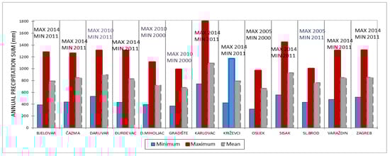 Minimum, maximum, and mean annual precipitation sums between 1981 and 2018 at 13 meteorological stations are presented in Figure 3. The years 2000 and 2011 were extremely dry in the entire study area. However, 2010 and 2014 were wet years as the annual precipitation was greater than the average at the most stations. Temporal statistical homogeneity was tested by the RAPS method and showed that all meteorological stations have homogeneous annual precipitation data series. Increasing precipitation trends are insignificant (Table 3). Only two stations have a weakly increasing trend at a 95% confidence level (α = 0.05).