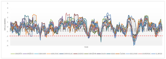 SPEI-12-month values of 13 analysed meteorological stations during the period 1981–2018.