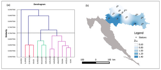 (a) Dendrogram of SPEI trend, (b) spatial distribution of Mann–Kendall ZMK coefficients.