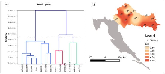 (a) Dendrogram of the mean air temperature trend, (b) spatial distribution of Mann–Kendall ZMK coefficients.