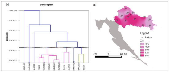 (a) Dendrogram of annual precipitation trend, (b) spatial distribution of Mann–Kendall ZMK coefficients.