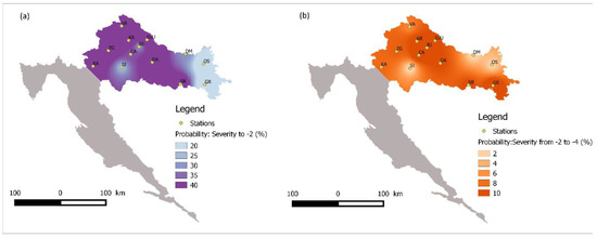 Together with chosen marginal distributions, correlation coefficients are shown in Table 6. The equivalent rank order coefficient ranges between 0.99 and 0.89. The lowest value of Kendall’s Tau coefficient was obtained for Gradište station (0.65), and the highest for Sisak station (0.91). The obtained correlation coefficients are high enough so that the copula function can used. Based on the previously mentioned criteria, for every station, the most appropriate copula function was selected for the joint distribution function of drought duration and severity (Table 6). For every station, 10,000 random pairs of severity-duration data were generated using the selected copula function in order to calculate the probability of simultaneously occurring drought with high severity and three months duration (at least). For every station, these probabilities were obtained, and results for severity up to −2 and between −2 and −4 are shown in Figure 9.