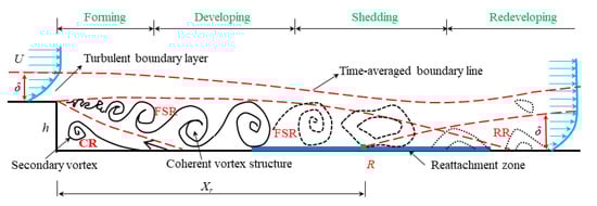 Figure 1 shows the typical flow structures in a two-dimensional BFS. Flow separates at the step edge (step height, h) and reattaches the bottom wall at some distance downstream, forming a recirculation region behind the step. This process consists of most physical features of a separation-reattachment flow, such as the free shear layer, the reattachment zone, and the redeveloping boundary layer [,,,,,,]. The recirculation region is extensively studied in the previous researches. Length of this region (recirculation length, Xr) keeps a relative stable value of (7 ± 1) h for a developed turbulent flow, while it increases for a laminar flow and decreases for a transitional flow with the increase of Reynolds number []. The time-averaged flow structure is believed to be stable in a developed turbulent flow such as the free shear region (FSR), the corner region (CR), the redeveloping region (RR), and the reattachment zone []. These regions show various flow characteristics. The FSR is generated from the step top corner with strong shear intensity and finally limited by the bottom wall. The CR is located at the step corner with a secondary backflow. The RR shows a new development for the turbulent boundary layer after reattachment. The reattachment zone is defined as the locus of points, where the limiting streamline of the time-averaged flow rejoins the surface []. For the temporal flow, perturbation of the step generates successive CVS which promotes the fluid mixing and intensifies the unsteady interaction. The CVS shows four typical developing stages with various characteristic frequencies in the flow direction: forming, developing, shedding, and redeveloping [].