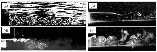 Flow visualization is first used to investigate this flow. Tani et al. (1961) [] showed aluminum-power pictures of an instantaneous BFS flow and found that short exposure pictures reveal some distinct vortex structures (CVS) in the recirculation (Figure 2a), while pictures of long exposure only indicate something like that shown in the mean dividing streamlines. The CVS present formation, merging, and increasing irregularity with the increase of shear layer turbulence and persistence of the structures downstream of reattachment (Figure 2b–d) [,]. The CVS are believed to be rolled up in the strong shear layer, which grows with a vortex pairing mechanism until it approaches the reattachment zone [,,,,]. In the reattachment zone, the CVS are torn roughly into two in the neighborhood of the reattachment point (R), where part of the flow is deflected upstream into the recirculation region to supply the entrainment and another part continues downstream []. McGuinness (1978) [] believes that some CVS are swept upstream with the recirculating flow, while others proceed downstream. The fact that CVS move alternately up and downstream is also supported by the measurements of Chandrsuda (1975) [] and Kim et al. (1978) []. In first part of the FSR, CVS and their evolution are usually explained by the Kelvin-Helmholtz instability that proposed in a plane mixing layer. However, BFS flow shows some differences [,]: (1) The free shear layer has a finite length due to the reattachment, which limits the development of the CVS; (2) The free shear layer supports an adverse pressure gradient and is curved; (3) Strong interaction between the unsteady shear layer and the reattachment wall generates substantial acoustic and convective disturbances, that feed back through the recirculation to influence the shear layer at separation. The peak value of turbulence intensity in a BFS flow is 10~20% higher than that of a plane mixing layer []. Additionally, local forcing with certain frequency is proved to contribute to amalgamation of the CVS and fluid mixing (Figure 2b,c), which also shortens Xr [].
