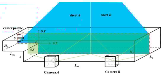 According to the previous literatures, Xr behind step was about (4.2~8.6) h when flow was fully turbulent, and it was even longer for a lower Reynold number [,,,]. To study the evolution process of the CVS, a global view of velocity fields with no less than 10 h (about 60 cm) behind the step was expected. A large-scale field of view was difficult to realize with high vector density and high precision. To obtain the global velocity field, some previous studies took pictures of different subareas and matched the time-averaged velocity fields spatially [,]. However, this was still unavailable for the global view of the instantaneous velocity fields with CVS’ evolution process. This study developed a synchronous PIV system, by which a doubled and effective view of the instantaneous velocity field was achieved (Figure 3, Sheets A and B).