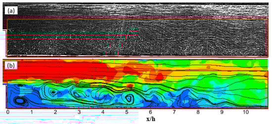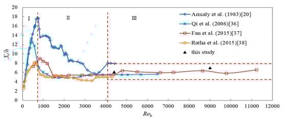 Figure 4 shows the relationship between Xr and Reh. Three typical flow regions were identified: the laminar flow (region I, Reh < 740), transition flow (region II, 740 < Reh < 4070), and turbulent flow (region III, Reh > 4070). A relative stable recirculation region with a constant Xr value (4.2~8.6 h) occurs in the turbulent flow (III) [,,,,]. The flow structures in this flow region (III) were proposed to be stable, while the Xr values in another two flow patterns (I and II) were both changeable. Since most flow are with high Reynolds number in real applications, the turbulent flow region (III) were particularly favored here. For comparison, two cases with Reh = 4400 and Reh = 9000 were analyzed (Table 2). In addition, the good agreement of the data points in Figure 4 also verify the reliability of the measuring instrument.