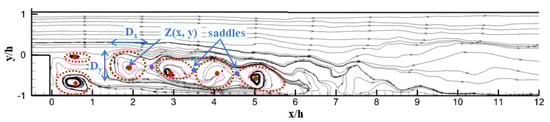 To quantitatively describe these CVS, some basic parameters such as the locations and patterns are defined (Figure 6). The common center of streamlines is regarded as the vortex core (Z(x, y)), representing location of a vortex. The typical shape is regarded close to an ellipse with streamwise diameter (Dx), and vertical diameter (Dy). Thus, Dx/Dy represents width to height ratio and D = 0.5 × (Dx + Dy) indicates the mean scale. Two CVS are separated by an equilibrium point, called the saddle point.