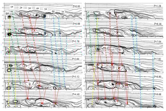 Figure 7 shows the spatial and temporal evolution process of the CVS in streamline pictures. Totally 12 instantaneous streamline pictures with an interval time of 0.5 s are compared (T = tUb/h = 0.00~9.68). These streamlines are generated with the corresponding velocity matrix by TECPLOT 2013.
