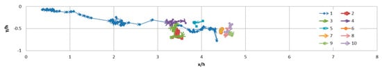 The life process of the CVS is also reflected in the temporal evolution of an individual vortex structure. The blue line tracks the trajectory of a typical vortex center and other color lines show some break up and amalgamation (Figure 8). In this figure, the blue diamond point means the vortex center and the arrows show its moving direction. It starts nearby the step corner, and then travels toward the reattachment zone. It initially wanders in the strong shear layer, forming a relatively narrow path in the first stage (forming stage, 0~2 h). When arriving to the end of this stage, the center “jump” at about x = 1.5 h, which can be explained by the amalgamation (merged by the vortex in later stage) shown in Figure 7. Then the vortex lingers and fluctuates particularly around x = 2.2 h and x = 3.4 h in the developing stage, where frequent amalgamation and division events occur there. The branches lines with other colors indicate vortex structures breaking up from the original one. When travelling to the end of this stage (x = 4~5 h), the original vortex could not be found in the streamline pictures.