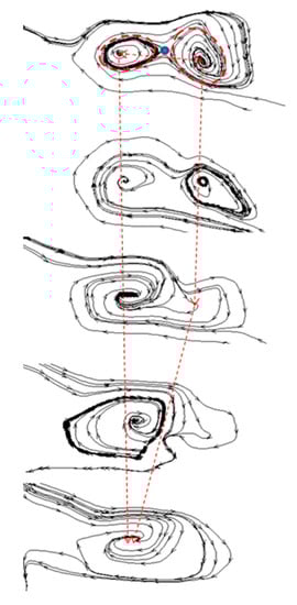 As is shown in Figure 9, two CVS keep independent initially when they stay at a sufficiently far distance. As they are getting closer, they change in shape and start to interact with each other and finally come to an amalgamation when their distance is less than the critical value (λ’ < λc). This indicates that critical distance still exists in current CVS. From the point view of the direction of the streamlines, these two CVS have an opposite streamline direction, one converges to the center (right) and another originates from the center (left). The former one is usually stable, while the other one is unstable. They finally merge into a stable one (streamlines converge to the vortex center).