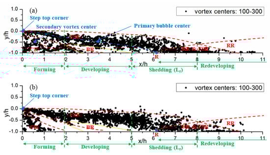 Figure 10 shows the distribution of the vortex centers with Reh = 4400 and 9000 separately. The distribution seem to be regular, that fit well with the divided flow regions and developing stages (Figure 1). The vortex centers mainly distribute in the FSR, CR, and RR. In other words, these CVS are directly and closely related to the flow separation and reattachment characteristics. And they present specific features in different regions, going through the process of forming, developing, shedding, and redeveloping when travelling downstream. This statistical distribution also supports well the above discussion on vortex center trajectory and vortex evolution. With increase of Reh from 4400 to 9000, the distribution of vortex centers is almost unchanged in space. It provides a good explanation for the various features with the specific flow structures.