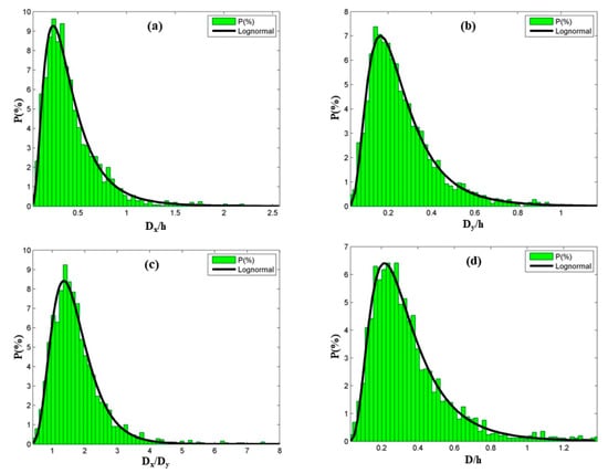 Distribution of length scale parameters (Reh = 4400): (a) Dx; (b) Dy; (c) Dx/Dy; (d) D.