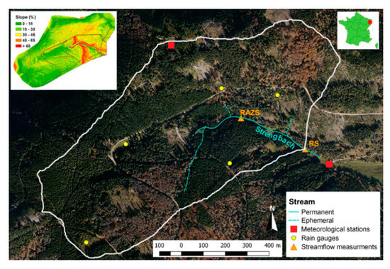 Map of the Strengbach catchment with the stream network and the equipment used for meteorological, geochemical, and hydrological monitoring. The land slope (%), derived from a high-resolution LIDAR survey (0.5 × 0.5 m), is shown in the upper left frame.