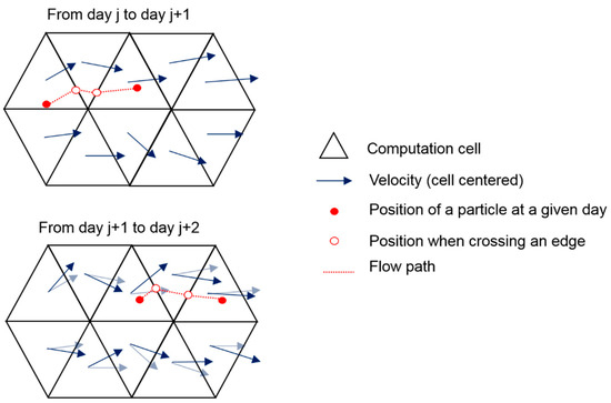 where Xk,next is the location at the next time step, Xk,start is the starting location, V(Xk,start) is the velocity vector in the cell of the current location of particle k, and Δtk is the time taken by the particle to move from Xk,start to Xk,next. In practice and as illustrated in Figure 2, a particle located in a current cell moves according to the velocity vector of the cell until one edge of the cell is reached. When on the edge, (1) the location Xk,next and arrival time are recorded; (2) the location Xk,start is updated; (3) the velocity vector of the particle is also updated to reflect the value and direction of the neighboring cell; and (4) the particle displacement is resumed. The time step Δtk varies over time because of the space and time variability of the velocity field and also because of the geometrical characteristics of the computational mesh. Therefore, Δtk is computed independently for each particle and each jump depending on its flow path. It is worth noting that for transient-flow conditions, the whole velocity field is also updated (here with a daily time interval), making it possible for a particle to be located within a cell (and not at an edge) as the velocity field changes. All the times and positions when a particle hits an edge or when the velocity field is updated are stored, allowing the positions of all the particles to be determined at a given time.