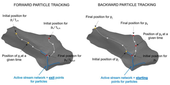 Illustration of forward and backward particle-tracking formulations. Only two particles are represented to avoid overly detailed sketches.