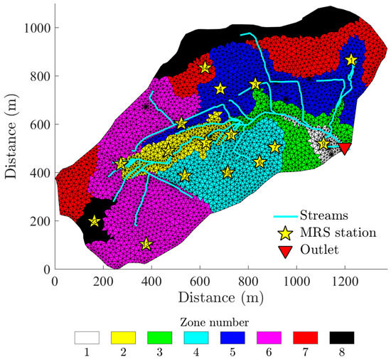 The computational mesh used both for the simulations with NIHM and for the particle-tracking calculation is generated from a fine LIDAR survey of 0.5 × 0.5 m resolution. The resulting computational domain of 10,250 elements is shown in Figure 4. The resolution is much finer close to the stream and close to the locations where MRS measurements are available, with an elementary cell size of 1 m. This refinement helps properly capture the hydrological processes in the hyporheic zone close to the stream, and to obtain a high resolution over space of the subsurface storage close to MRS measurements. On hillslopes, where flow is mainly triggered by gravity forces (and rainfall inlets), a cell size of approximately 20 m is enough for an accurate depiction of the flow field.
