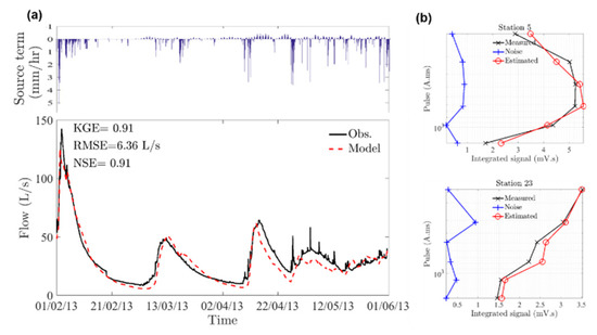 Evolution over time of simulated and observed streamflows for the calibration period (a) and comparison between simulated and measured integrals of the MRS signals at stations 5 and 23 (b).
