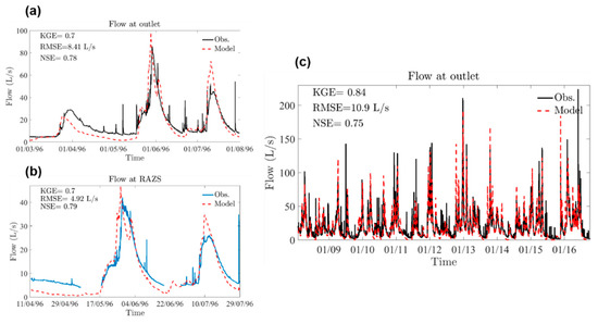 Figure 6 shows the comparison of simulated and measured discharges at the outlet and at the RAZS station for the two verification steps. (To reiterate, the RAZS station was availably only during the first verification period.) Note that there are missing values in the RAZS streamflow chronicle associated to the breakdown of the measurement device. Even though the efficiency coefficients are smaller than for the calibration period, these coefficients (KGE, NSE, and RMSE) are still high. Although the matching of model outputs and data is good, it is noticeable that for both verification periods, the model tends to slightly overestimate the peaks of streamflow and underestimate the discharge during recession periods. This model behavior was foreseeable as a consequence of the main assumptions about flow that allowed us to build the low-dimensional subsurface compartment in NIHM [36]. Even though the amplitude of the peaks is not always perfectly reproduced, no significant time lags between the simulated and observed hydrographs occur, showing that the overall diffusion times for flow at the scale of the catchment are well-reproduced. The slight discrepancies between simulated and observed discharges at RAZS can be explained by the specific location of the measurement point, just downslope from a small, localized contributing saturated area. Capturing the flat head gradient in such zones surrounded by steep topographic slopes is difficult. Small discrepancies could easily result in either the underestimation of discharge during recessions, because of head gradients that are slightly too flat, or the overestimation of discharge during periods of peak flow, as a consequence of a sudden increase in the simulated head gradients. Finally, the comparison of simulated and observed discharges for the verification periods remains convincing, resulting in a model able to capture the flow dynamics of the entire catchment and to render valuable estimates of transit-time and residence-time distributions.