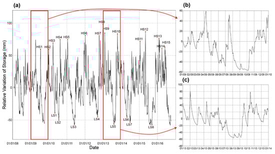 Evolution of water storage within the whole catchment during the period 2008–2016 (a). The labeled peaks in the plot correspond to reference dates at which residence- and transit-time distributions were estimated. HS stands for high-storage periods and LS for low-storage periods. Focused plots illustrate the seasonal and inter-annual storage variability for the years 2009 (b) and 2013 (c).