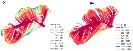 Maps of the flow paths inferred from backward particle tracking for the high-storage date HS9 (a) and low-storage date LS6 (b). The ten classes of times (days) along the flow paths are defined using equal counts in each class, thus setting the boundaries for classes that differ between HS9 and LS6.
