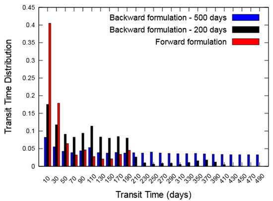 Comparison between transit-time distributions computed using backward and forward particle tracking. With the backward formulation, the distribution must be cut beyond a prescribed time to avoid excessive sampling of very long times associated with the stagnation of particles at the boundaries of the domain. The blue plot corresponds to a 500-day cut-off and the black plot to a 200-day cut-off.