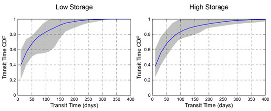 Cumulative transit-time distributions obtained via forward particle tracking for low-storage (LS) and high-storage (HS) conditions. The blue line represents the average distribution estimated over all the LS or HS dates considered (see Figure 7). The gray envelope shows the variability of the distributions by indicating the minimum and maximum cumulative probabilities of a given time.