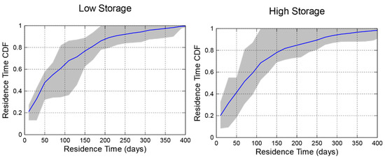 Cumulative residence-time distributions obtained via forward particle tracking for low-storage (LS) and high-storage (HS) conditions. The blue line represents the average distribution estimated over all the LS or HS dates considered (see Figure 7). The gray envelope shows the variability of the distributions by indicating the minimum and maximum cumulative probabilities of a given time.