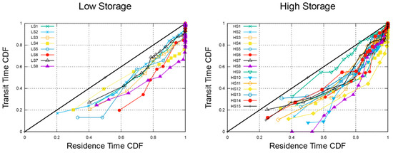 StorAge Selection (SAS) functions for low-storage (LS) and high-storage (HS) conditions. SAS functions are represented in a cumulative (CFD, cumulative density function) form by plotting for various times the cumulative transit-time probability versus the cumulative residence-time probability.
