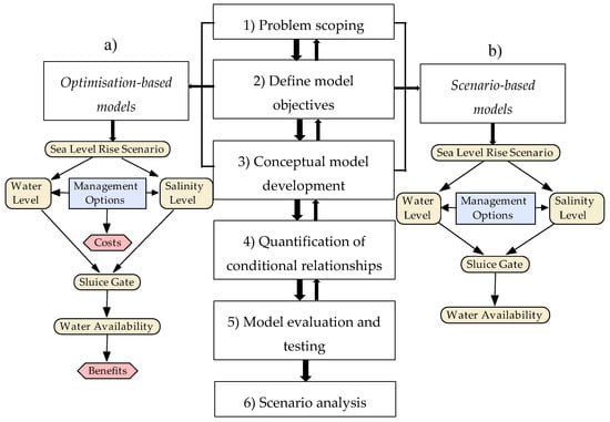 Main steps in developing a Bayesian network (BN) (adapted from Ames et al. [16], Bromley et al. [19], Ticehurst et al. [20]), and an example BN configured for: (a) Optimization-based decision support, featuring a decision node (coloured blue) with an associated cost node indicating the costs for implementing the different management options, and a benefit node indicating the desirability of the different states of water availability which result at the output node; (b) scenario-based decision support, featuring a decision node without the associated cost node, and an output node without an associated benefit node.