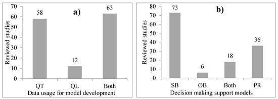 Almost half of the reviewed studies (47%) applied both quantitative and qualitative data to construct DAGs and populate CPTs in their BNs (Figure 2a). Quantitative data was used by only 58 reviewed studies (44%), whereas very few studies (9%) developed networks using only qualitative information (Figure 2a).