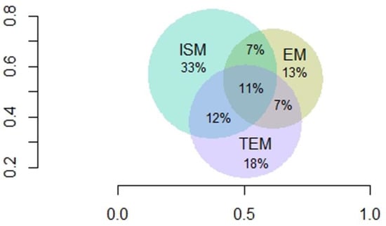 Evaluation of different categories of management measures in the reviewed studies. ISM: Institutional and social measures, TEM: Technological and engineered measures, EM: Ecosystem-based measures.