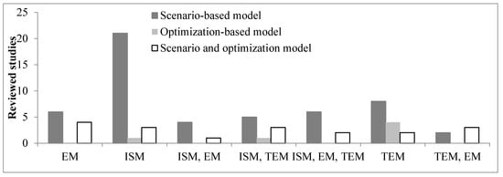 Scenario-based approaches were used frequently to evaluate every category, and category combination, of management measures (Figure 4). In contrast, optimization-based approaches were applied significantly less frequently to evaluate the performance of institutional and social measures. A chi-squared test of independence indicated that there was significant dependence (p = 0.076) between the types of management measure(s) being evaluated and the decision support approach used for that evaluation (optimization-based model versus scenario-based models versus combined optimization and scenario-based models).
