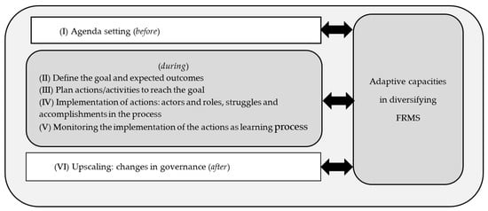 In order to assess adaptive capacities and learning, the concepts of the ACW and the three loops of learning are combined in one analytical framework (Figure 2). Herewith, the framework aims to identify and analyze the adaptive capacities of governance networks and their importance for developing more diversified FRMS. Based on the Dynamic Adaptive Policy Pathways approach [,], six relevant steps for pilot projects were identified as part of adaptive planning processes. These steps are further divided into the situation before, during, and after the pilot projects. New diversified strategies, which include new actors, institutions, policies, and other aspects, require new knowledge, types of collaboration, and other capacities. Therefore, the goal is to understand how the concept of adaptive capacities supports the identification of requirements for diversified FRMS.