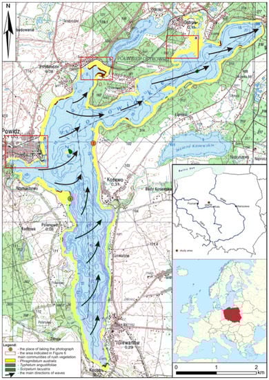 Detailed field studies, including an inventory of coastal vegetation, were made in 2009. The studies were repeated in 2014 and 2015. They included determination of the area covered by emerged vegetation, with particular emphasis on the type of dominant plant communities and range of communities developing in recent years. Measurements of coastal vegetation ranges were carried out from the boat and land using a measuring tape and a handheld GPS of the Garmin GPSmap 60Cx type. In randomly selected locations, an additional measurement was made using a measuring tape in transects located perpendicular to the shoreline, from the first compact occurrence of rush vegetation to its maximum extent in water. The obtained field data were applied to orthophotomaps at the scale of 1:5000 using the ArcGIS 10.0 program. At the same time, photographic documentation of the described zones was made. In the littoral and coastal zones, the areas of the dominant communities were calculated, taking into account the presence of trees within the areas covered with rushes.