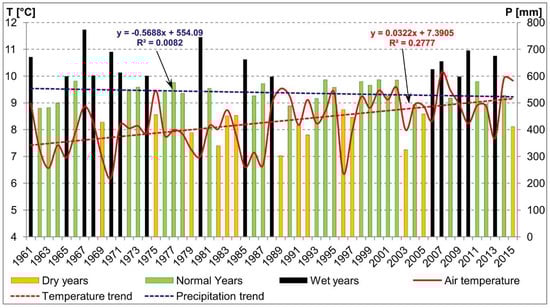 Annual average temperatures and annual precipitation divided into dry, normal, and wet years in the region of Lake Powidzkie (based on The Institute of Meteorology and Water Management—National Research Institute (IMGW-PIB) data).