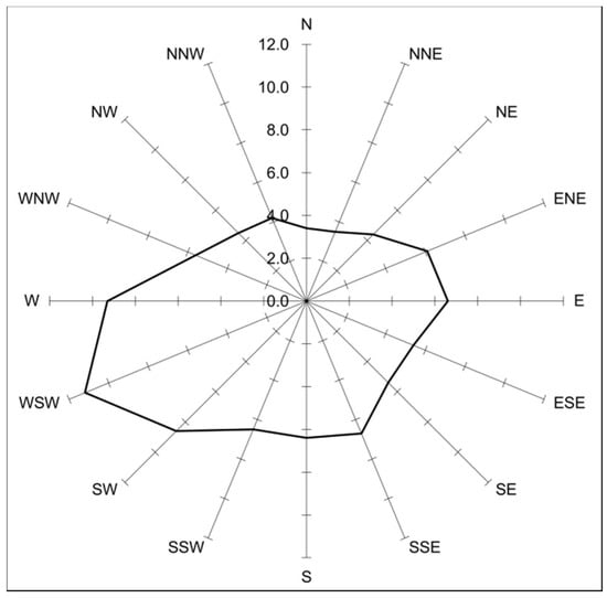 The catchment area of Lake Powidzkie is characterized by low annual precipitation, which, on average, does not exceed 510 ± 113 mm/year (Figure 2). The average annual air temperature is around 8.5 ± 0.9 °C. During the analyzed 55 years (1961–2015), an increase in the average annual temperature of 0.32 °C dec−1 was observed, accompanied by slight changes in precipitation (Figure 2). The occurrence of several alternating very dry years (i.e., 1982, 1989, 1992, 2003, and 2015) and wet years (i.e., 1967, 1970, 1980, and 2010) was detected (Figure 2). As a result of the increase in the annual temperature and decrease in the relative air humidity, the potential evaporation rate is systematically increasing and currently reaches values exceeding 637 ± 90 mm/year. Winds dominate from the western sector (Figure 3).