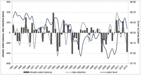 Changes in the average annual water levels, climatic water balance (differences between precipitation and evaporation), and water retention in Lake Powidzkie during 1961–2015.